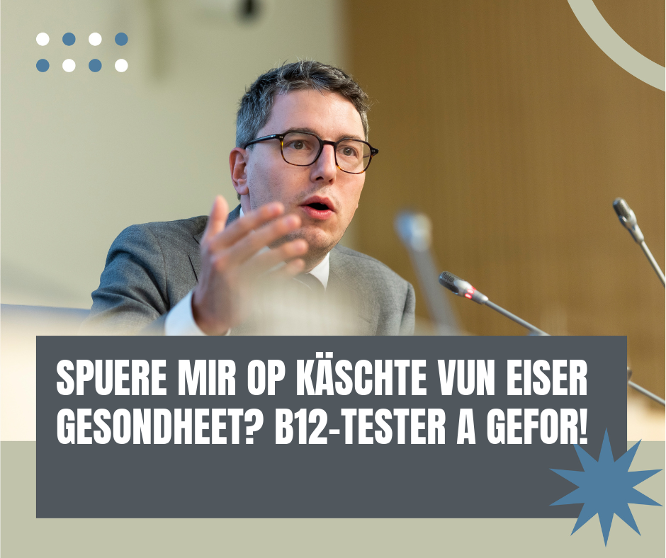 [INTRO - 3s] [VISUAL: Close-up, serious look] Hey! Wosst du datt d'Regierung bei Vitaminn B12 Tester spuere wëll? Dat kéint geféierlech ginn.